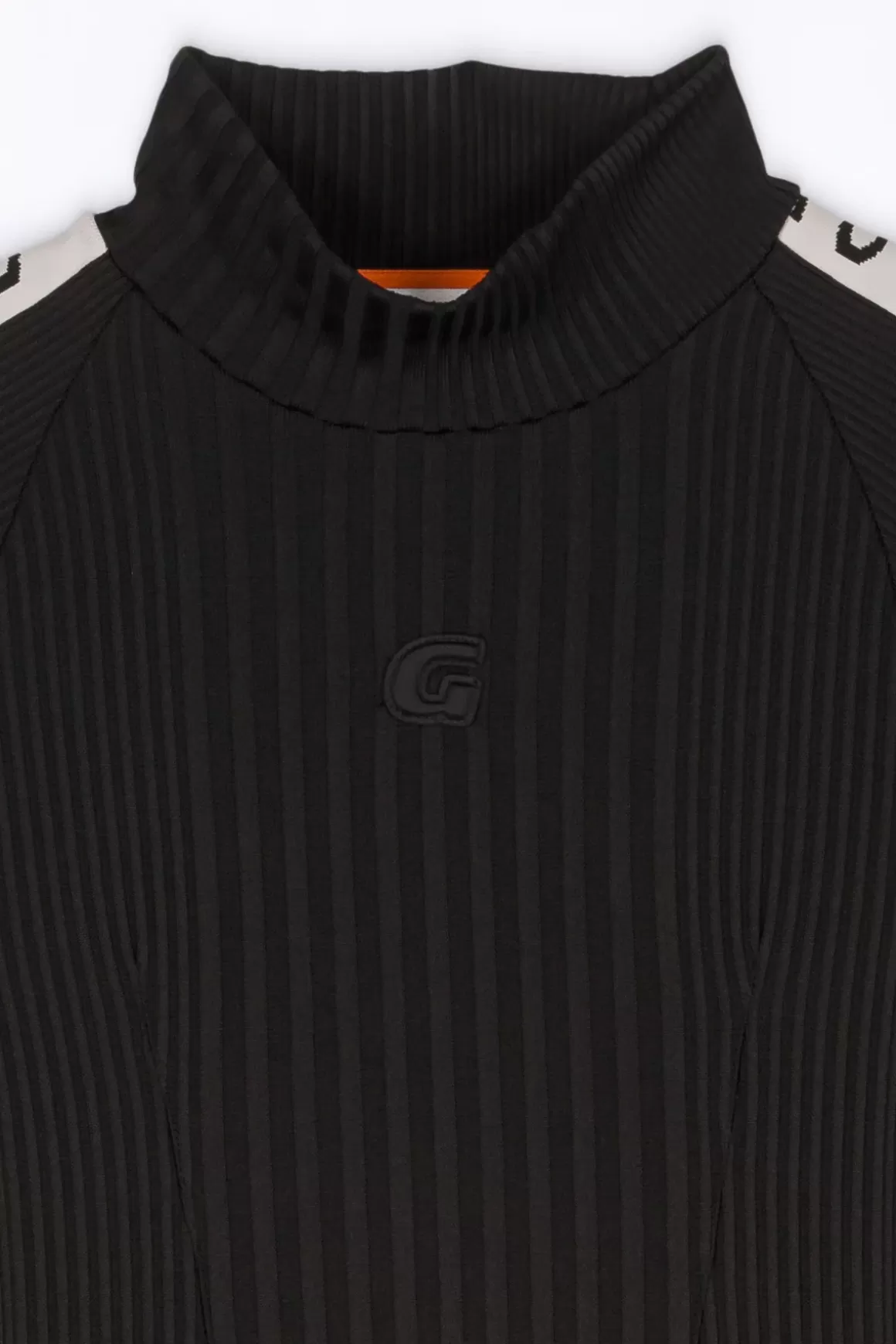 Minou Est Une Robe Courte Ajustee Et Fendue, Confectionnee En Maille Rib. Le Col Est Montant. Les Manches Raglan Sont Munies De Passe-Pouce Et Ornees De Bandes Contrastees Ou Le Logo De La Marque Apparait Facon Jacquard. Un Patch Ton Sur Ton Est Applique Sur Le Milieu Devant.