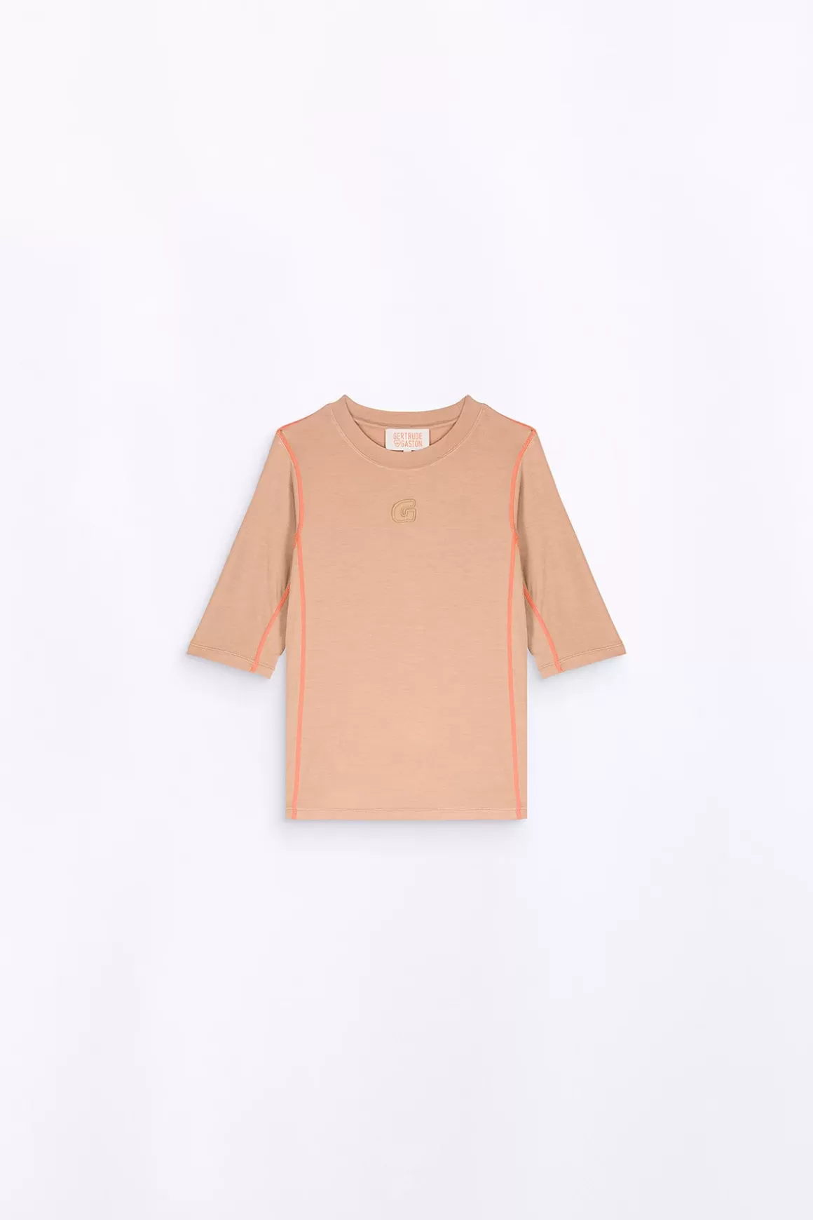 Adeline Est Un T-Shirt Ajuste Pres Du Corps A Col Rond Et A Manches Courtes. Sa Matiere Toucher Doux Le Rend Particulierement Agreable A Porter. Des Surpiqures Contrastees Mettent En Valeur Les Emmanchures Et Les Decoupes Cote. Un Patch Ton Sur Ton Est Appose Sous L’Encolure Milieu Devant.