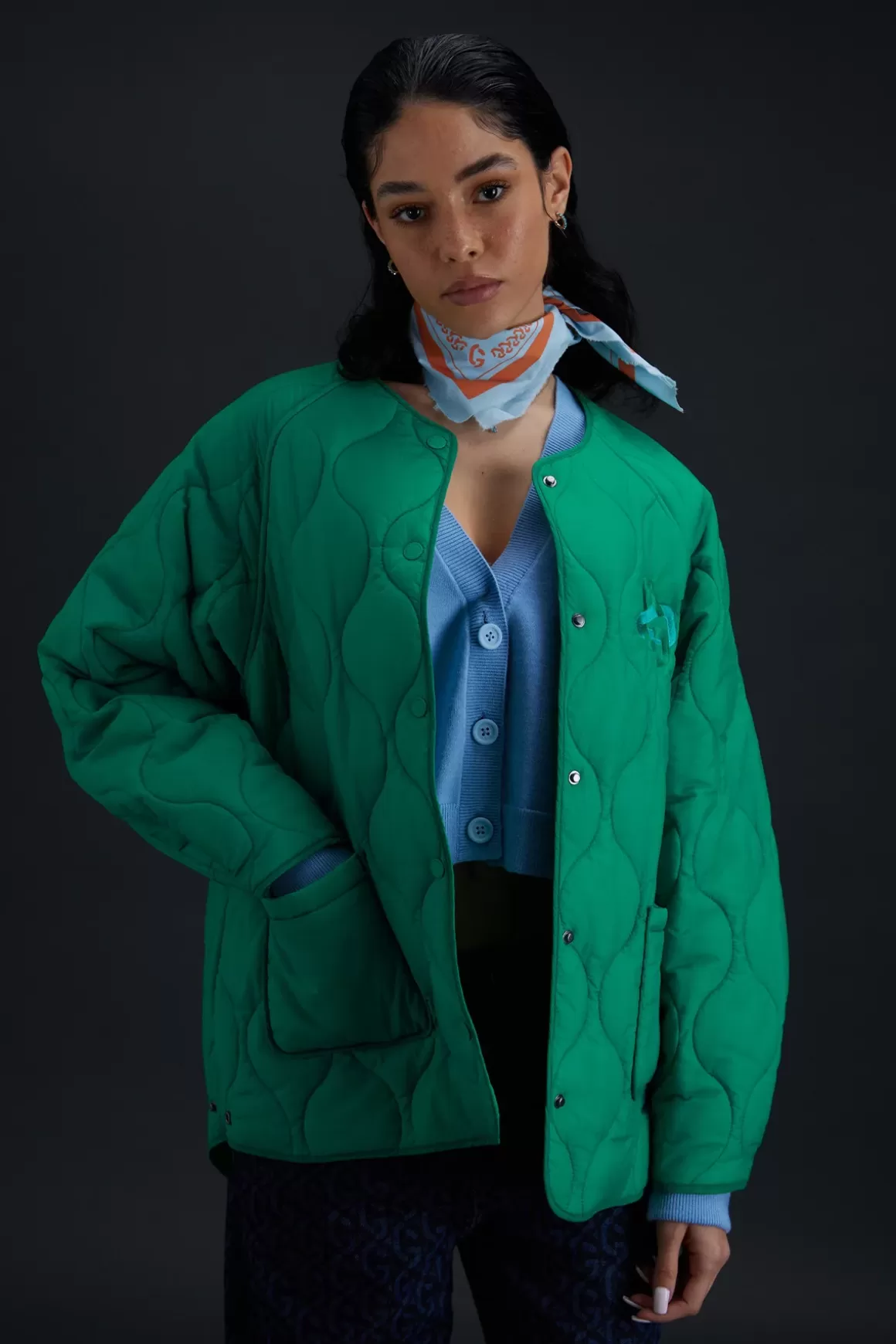 La Veste Matelassee Oversize Quiltee Et Sans Col Juliette Est De Forme Trapeze. Ses Manches Raglan Grace A Des Pressions Sur Le Cote Et En Bas De Manche. La Fermeture De La Veste Est Pressionnee. Un Biais Finit L’Encolure, Les Manches Et Le Bas De Vetement. Deux Poches Sont Plaquees Sur Le Devant. Une Broderie Contrastee Orne La Poitrine. Le Patch Silicone Ton Sur Ton Iconique Est Appose Sur L’Epaule.