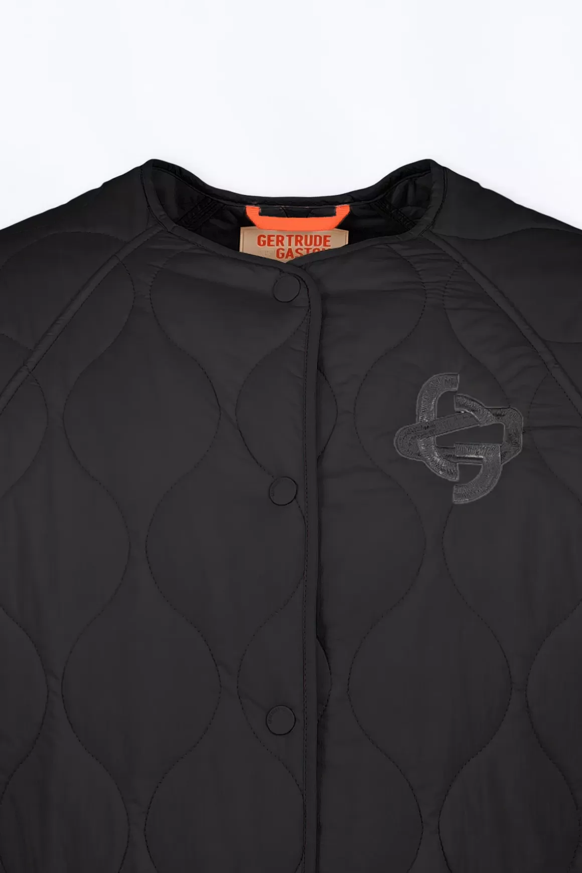 La Veste Matelassee Oversize Quiltee Et Sans Col Juliette Est De Forme Trapeze. Ses Manches Raglan Grace A Des Pressions Sur Le Cote Et En Bas De Manche. La Fermeture De La Veste Est Pressionnee. Un Biais Finit L’Encolure, Les Manches Et Le Bas De Vetement. Deux Poches Sont Plaquees Sur Le Devant. Une Broderie Contrastee Orne La Poitrine. Le Patch Silicone Ton Sur Ton Iconique Est Appose Sur L’Epaule.